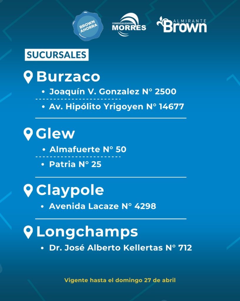 En este sentido, las sucursales disponibles son las ubicadas en Hipólito Yrigoyen N° 14.677 y en Joaquín V. González N° 2500, en Burzaco; Avenida Lacaze N° 4298 de Claypole; Almafuerte N° 50 y sobre la calle Patria N° 25, en Glew; y en José Alberto Kellertas N° 712 de Longchamps, cuya atención es a partir de las 13 horas.