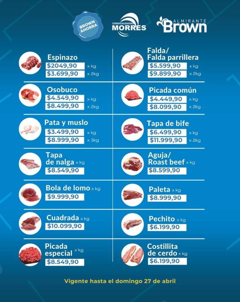 El Municipio de Almirante Brown renovó nuevamente el Acuerdo de Precios que mantiene con frigoríficos de nuestra región, gracias al cual se pueden adquirir cortes de carne a precios muy convenientes, como por ejemplo el kilo de tapa de bife a $6.499 por kilogramo.