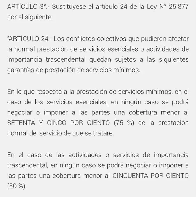 “En lo que respecta a la prestación de servicios mínimos, en el caso de los servicios esenciales, en ningún caso se podrá negociar o imponer una cobertura menor al 75% de la prestación normal del servicio que se tratare”, establece el nuevo artículo. Y continúa: “En el caso de las actividades o servicios de importancia trascendental, en ningún caso se podrá negociar o imponer a todas las partes una cobertura menor al 50%”.